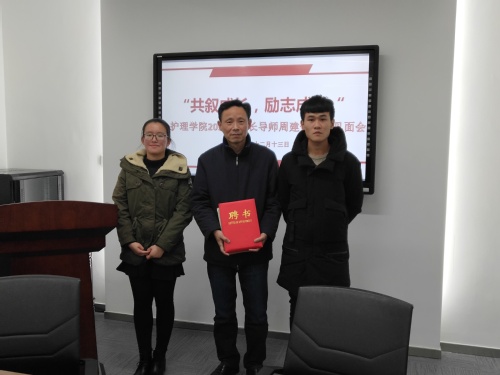 见面会的最后,班长张恒和团支书张莹湘为成长导师周院长授予了聘书并合影留念。经过这次师生见面会,在座所有同学纷纷表示从中受益颇多,不辜负周院长的殷切希望,不忘初心,找准定位,并为此付出不懈的努力。
