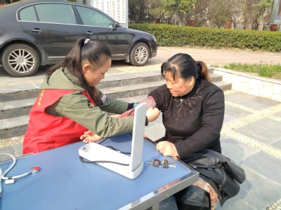 3月25日清晨志愿者领队戴雨婷带着成员杨海燕、刘云、熊正艳、吴怡雯等五人来到方山社区进行义诊活动,志愿者们到活动地点后都各自忙碌起来,有人负责抬桌子,有人负责拿板凳……爷爷奶奶们也已经在边上等着志愿者们给他们测量血糖血压,同学们把仪器摆好后很快地进入状态,各司其职,也不忘团结合作。