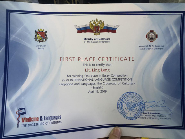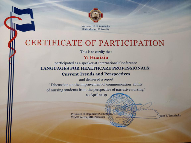 比赛内容包括听说读写四方面,听力阅读写作内容均为与医学相关话题考察(含动物实验等)。在口语测试环节,参赛学生向考官陈述自己对所公布话题的看法,并回答考官相应问题。我校同学在整个比赛中展现出了南京医科大学学生的自信与实力,条理清晰地向考官陈述自己的观点,从容应对考官抛出的问题,其中我院研究生分别获得了象征自己实力与个性的独特奖项——刘玲珑同学获“写作比赛一等奖”、 “难忘表现奖”(Unforgettable Performance);易怀秀同学代表南京医科大学进行研讨会议发言,发言主题为“从叙事护理角度谈护生沟通能力的提高(Discussion on the improvement of communication ability of nursing students from the perspective of narrative nursing)”,同时获得“写作比赛三等奖”。希波克拉底曾道:世界上只有两种东西可以治愈人类,一种是医学,另一种便是语言。在倡导以患者为中心的护理理念中,如何运用语言来对患者产生积极作用是一个值得探讨的话题,对患者、护士、医生三方都有益处。在最后的交流阶段,来自不同国家和地区的医学生就“医学与语言”展开了自己的理解。俄罗斯的医护临床沟通技能同样不容乐观,人文医学尚处于发展阶段。