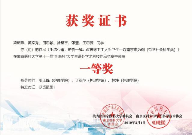 在刚刚结束的第十六届“挑战杯”大学生课外学术科技作品竞赛中,我院申报项目“手洁心暖,护爱一生:改善环卫工人手卫生——以南京市为例”获得江苏省三等奖。