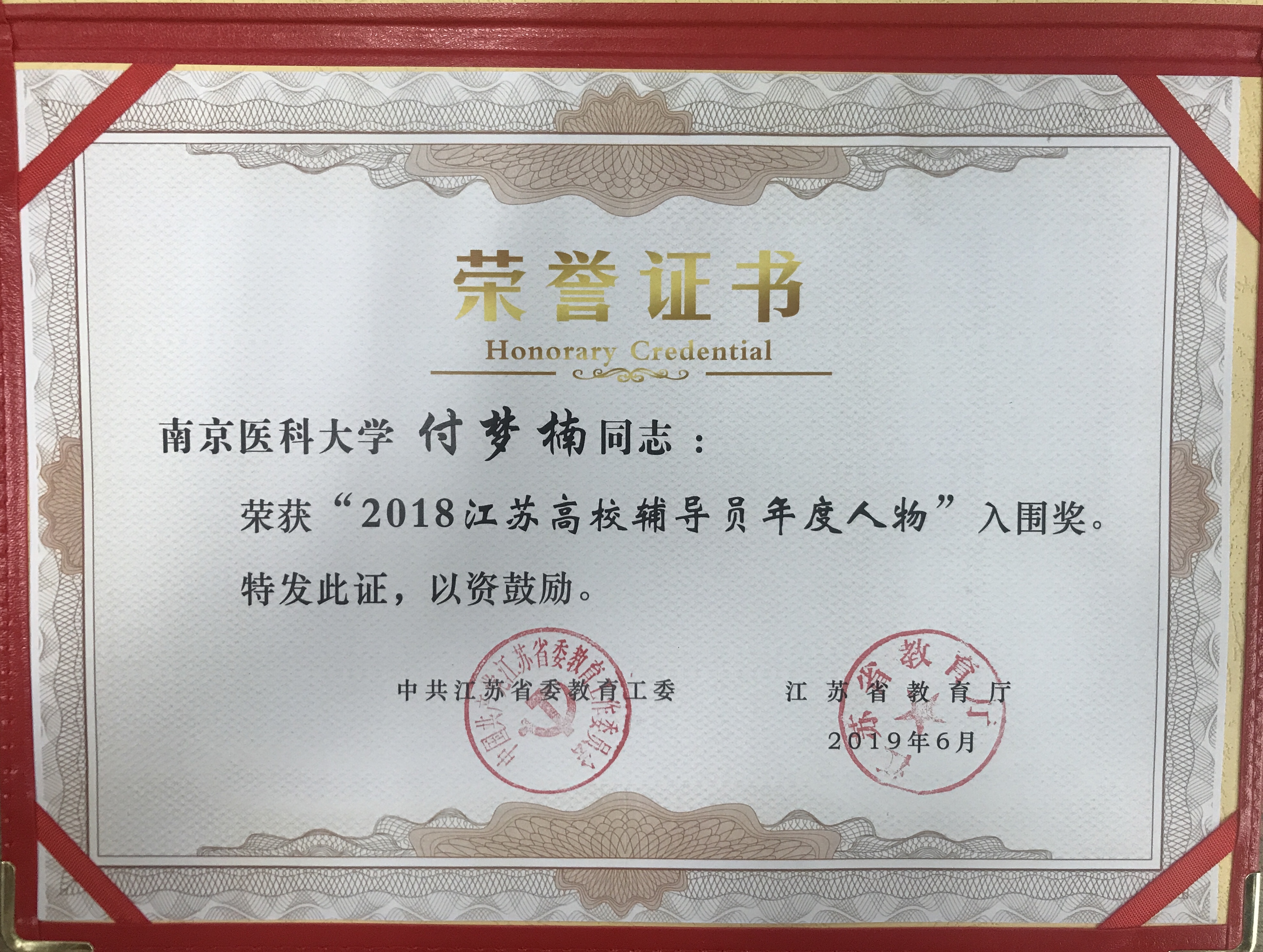我院付梦楠同志荣获“2018江苏高校辅导员年度人物”入围奖。