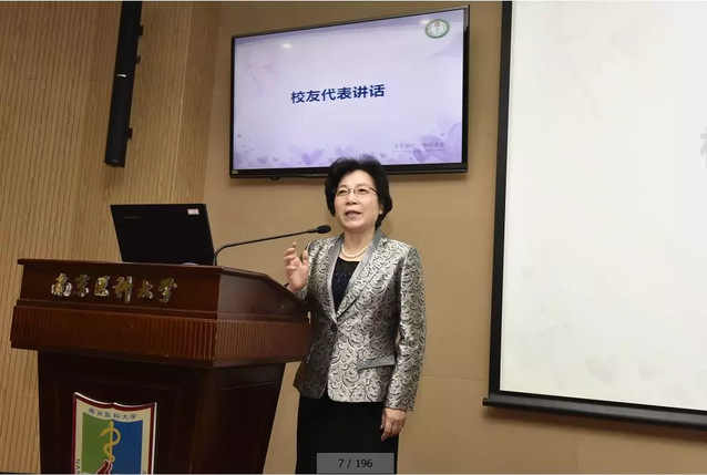 接着,校友代表上海市护理学会名誉理事长翁素贞前辈发表讲话。翁理事长表达了对母校强烈的感恩和眷恋之情。她回忆了曾经的求学经历,感恩母校的培育,强调南医护理的首创性,欣喜学校的巨大变化,期许母校的发展,约定情系母校、回报母校。