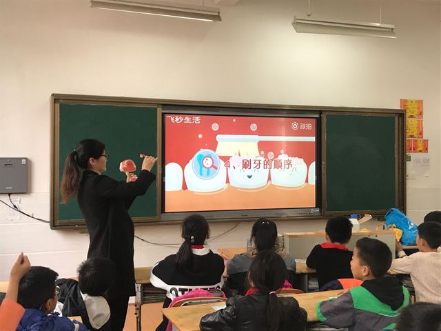 接着,张留馨同学又通过一个小故事引导同学们思考龋齿形成的原因及预防方法,并向大家介绍了如何正确选择牙膏和牙刷,正确使用牙线、涂氟、定期口腔检查等其他预防龋齿的手段。随后,余洁同学带着同学们观看了一段介绍正确刷牙方法的视频,并结合口腔模具进行现场演示。学习完毕,余洁邀请小朋友们上台展示,同学们都积极参与,展示了良好的学习成果。