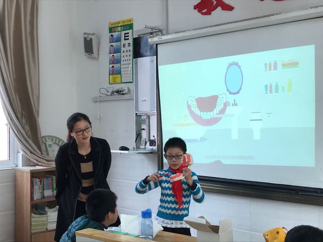 接着,张留馨同学又通过一个小故事引导同学们思考龋齿形成的原因及预防方法,并向大家介绍了如何正确选择牙膏和牙刷,正确使用牙线、涂氟、定期口腔检查等其他预防龋齿的手段。随后,余洁同学带着同学们观看了一段介绍正确刷牙方法的视频,并结合口腔模具进行现场演示。学习完毕,余洁邀请小朋友们上台展示,同学们都积极参与,展示了良好的学习成果。