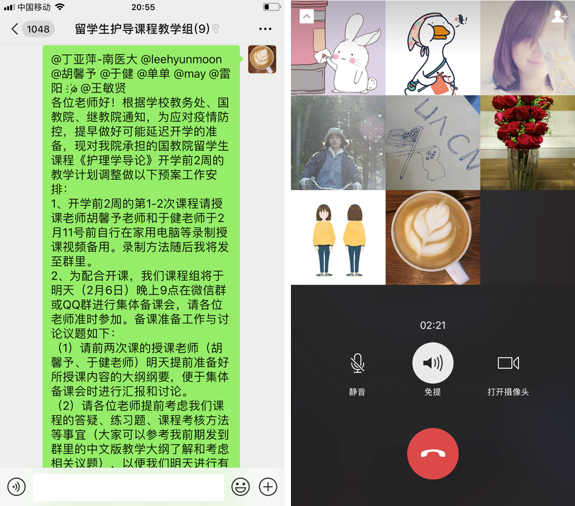 当前疫情形势下,为响应学校“停课不停学”的号召,执行好相关在线教学工作,我院基础与社区护理学系于202026日晚上09:0029日上午10:00采用微信群方式分别召开了本学期国教院留学生课程《护理学导论》的第一次线上集体备课会和教师试讲。会议由课程负责人王洁老师主持,丁亚萍副院长以及承担该课程授课任务的李现文、雷阳、单恩芳老师、一附院的胡馨予和于健老师、助教王敏贤同学参加了集体备课会。两次线上集体备课会的主要议程包括:前四次理论课授课内容与纲要的梳理、课程考核方式的讨论与确定、前两次课授课教师的试讲。