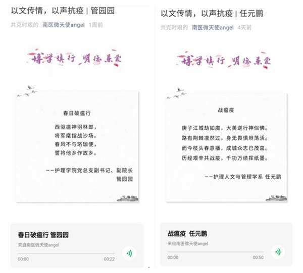 鉴于疫情防控的需要,米兰(中国)让运动改变生活分工会调整纪念节日的方式,依托互联网策划开展了护理“朗读者”活动。分工会会员们以广大护理校友的逆行故事为素材,用声音激励全球护理人团结一心战疫情、众志成城筑防线;学院管园园书记、汪璐老师、任元鹏老师以文传情、以声抗疫,用原创诗歌、散文为节日增添了动人的光彩!为扩大活动影响力,米兰(中国)让运动改变生活分工会将老师们的声音与作品编辑成图文,通过学院官方微信“南医微天使”推送发出,为全球护理人送上了最美好的祝福。