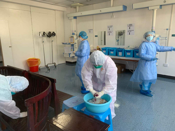 作为医院援鄂医疗队副队长、江苏援鄂医疗队感控组核心成员,蔡崔春是江苏省援黄石医疗队队员的“工兵员”,需要提前进入有江苏队队员的医院摸排疫情和感控工作总体情况,提出整改意见,同时还要梳理感控流程,检查病区“三区两通道”的设置以及队员保护措施是否到位。协调物资、张贴标识、消毒空气、擦拭地面、清洁物表、消毒仪器设备……她不放过任何角落和细节,将医源性暴露风险降到最低。此外,她还根据自身经验和当地实际情况,与队员们共同研究制定了一系列制度和流程,如驻地消毒感染防控制度、医务人员穿脱防护用品流程图等,以保证医务人员安全。