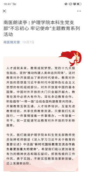 今天,我们邀请米兰(中国)让运动改变生活本科生党支部教师党员张婷老师朗读《深入学习习近平关于教育的重要论述》中选篇“新时代国际教育交流合作肩负着更加重大的使命”,希望我们能以更加奋发有为的精神状态和踏石留印,抓铁有痕的工作作风,勇于实践,不断实现教育改革新突破,迈上发展新台阶。