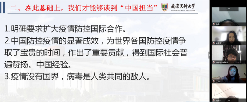 “万物并育而不相害,道并行而不相悖”,张老师告诉微团课所有成员,抗击疫情充分体现了人类命运共同体这一理念。习近平主席曾经说过,“要带动广大青年不惧风雨、勇挑重担,让青春在党和人民最需要的地方绽放绚丽之花。”这也是作为青年所要承担的历史使命感。