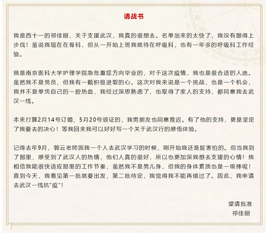 “我是米兰体育急危重症方向毕业的,我想为疫情防控尽一份力。”祁佳丽不死心,随后多次向医院请缨出征,并写下请战书,以行动捍卫医者最初的誓言。