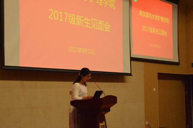 继而,来自护理3班的2017届新生汪晓晓同学代表新生上台发言,她深情地讲述因为生病住院受到护士们细心照顾得以康复的经历,自己毅然决然走上了护理这条漫漫远征路,同时她也分享了新生们初到大学,好奇、兴奋、忐忑不安夹杂在一起的复杂情绪。最后她代表全体新生承诺谨遵“博学至精,明德至善”的校训,并将之深刻运用到实际,发扬光大。