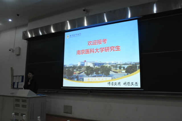 继而,南京医科大学研究生院招生办陈老师详细介绍了南京医科大学研究生院的招生情况,分析了南京医科大学研究生院的学位授权覆盖点、学位点建设、学科建设水平。他还为同学们详细介绍了最新考研流程:从上一年10月中下旬网报,现场确认,打印准考证,初试,初试成绩查询,国家复试分数线出台,复试调剂拟录取,政审调档签协议至当年6月录取通知书发放,层层选拔,陈老师从初试成绩要求和志愿选择两方面阐述当下考研的程序及要求,给予同学们一些选择建议。讲座最后,陈老师推荐了一些信息网站供同学们参考,例如中国研究生招生信息网。