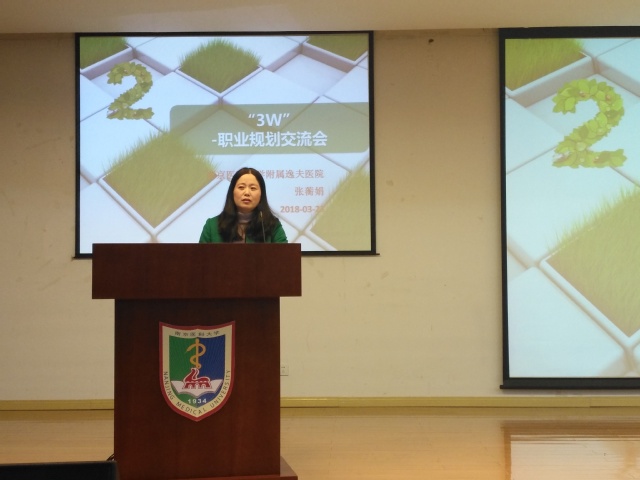 付老师讲授结束后,张护士长便向同学们畅谈了她的个人经历及经验。她通过一些案例名言和自己对生活职业的体会提出了“3W”这一概念,并且就同学提出的“医患关系”和“老年人护理”两个热点话题进行解答。