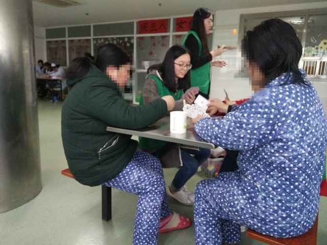 病人们非常和善有礼,会轻声细语询问志愿者能否使用折纸、书本等问题,会主动关切是否需要喝水。让志愿者感受到病区中的温暖。有一位志愿者打乒乓球比较厉害,和病区里的三位病人打球技术不相上下,此位志愿者被夸赞:“小姑娘打球挺厉害的。”