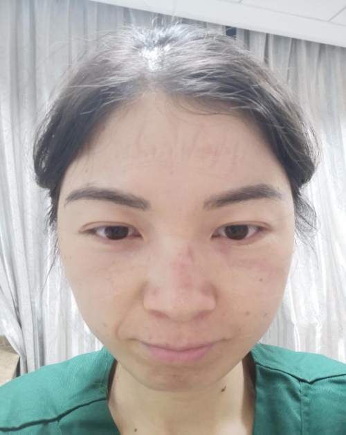 常州市第三人民医院作为当地的传染病专科医院,义无反顾的承担起此次抗击新冠的核心重任。董悦之得知医院要成立紧急救援队时,先后多次主动提交请愿书。正月初一的早上,她收到集合通知,与父母依依不舍的道别后,便迅速返回医院,与其它同仁会和,开始奋斗在常州一线岗位上。她工作的负压病房负责收治确诊与疑似病例,每天在岗的四小时中,需要不间断的为病房二十位以上的病人提供支持性护理治疗措施。在沉重的防护用具的遮盖下,视野因为呼出的雾气而不清晰,平日里看似简单的护理操作也因此变得难以推进。当面临抽血和穿刺时,她需要借助更明亮的光线,甚至暂时屏住呼吸以获片刻的视线清晰以及需要强大的心理应激能力。她心想:“病人已饱受病毒折磨,我一定要在确定穿刺成功的基础上为病人操作,不能再增添他们的痛苦了!”怀有这样信念的她,坚定信心,成功完成后续操作,收获病人感谢话语的那一刻,她的眼眶湿润了。董悦之说:“我感觉此时的我,是一名真正的白衣战士!那一道道被防护用具压出的痕迹是我此生最宝贵的勋章印记!”