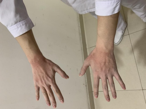 大年夜原本是中班的黄浩,被院部紧急从急诊抢救室调往发热门诊,承担该岗位负责人的职责。在发热门诊,护士不仅要做好新就诊患者的初步检验、护理体检和治疗,还负责留观患者的治疗实施与生活护理,帮助他们挂号、缴费、取药、取餐、泡水。当患者没有家属陪同时,他帮助其联系食堂订餐、购置生活必需品、给予适时的心理辅导。每天在发热门诊在岗的数小时中,口罩、帽子、防护服等医用防护用品穿戴时间过久,与众多护士一样,脱下防护服的那一刻,在他脸上留下了口罩压迫的伤痕、双手变得粗糙红肿、全身湿透、汗流浃背。