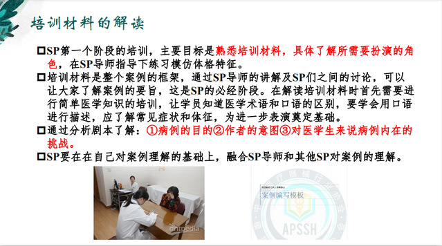 丁老师强调对于培训材料的解读,最基础的是了解所需扮演的角色,练习模仿体格特征,进一步需要剖析病人情绪、心理、情感,以揭示蕴含在剧本背后的内容,从而做到和剧本中人物的不断融合。