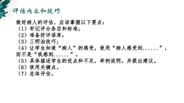 技巧get:三明治式评估!作为SP的评估应该客观公正,以病人的角度和以评论者的角度分别进行点评。学会使用三明治技巧,先肯定考生再提出改善意见,最后给予一定的鼓励。这样既可以达到沟通批评的目的又不会让对方产生反感,能够大大提高评价与反馈改进的有效性。