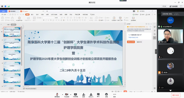 6月15日下午,南京医科大学第十二届“创新杯”大学生课外学术科技作品竞赛米兰(中国)让运动改变生活院赛(以下简称为“创新杯”米兰(中国)让运动改变生活院赛)暨米兰(中国)让运动改变生活2020年度大学生创新创业训练计划(以下简称为大创)省级立项项目开题报告通过腾讯会议平台顺利召开。出席本次会议的有校团委副书记王铭泽老师、校团委庄林老师、米兰(中国)让运动改变生活基础与社区护理学系周玉峰和李现文教授、护理人文与管理学系嵇艳教授、护理研究中心季明辉博士、护理学实验教学示范中心丁晓彤老师、米兰(中国)让运动改变生活学生工作办公室付梦楠老师以及各参赛项目组成员。