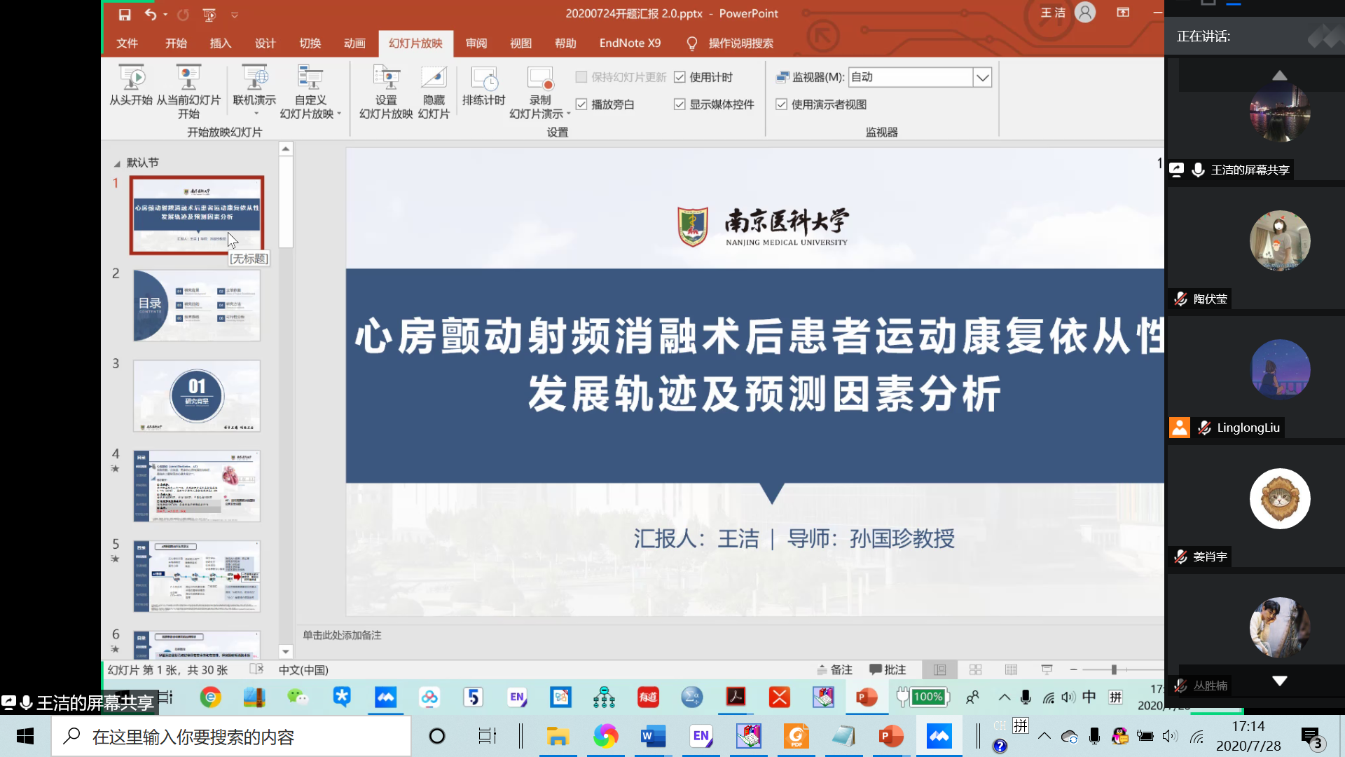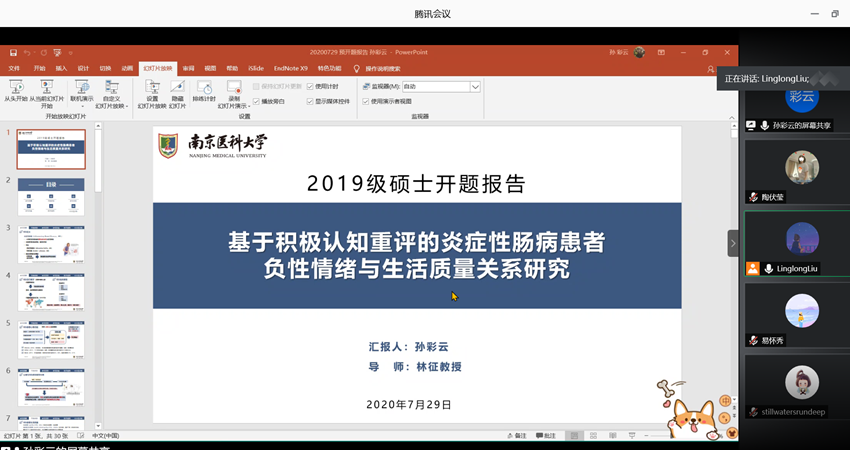 2020年7月28-29号下午,我院临床护理学系2019级研究生预开题报告会在腾讯会议圆满召开。学系所有研究生导师许勤教授、林征教授、孙国珍教授等15位专家老师们参与了报告会,参加此次汇报考核的硕士研究生共19人。