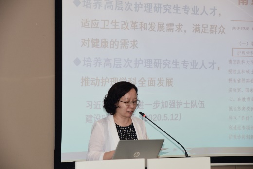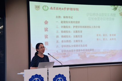 南京医科大学第一附属医院赵俊院长致词,肯定了护理学科创新团队建设的重要性,并从理念、过程、结果等角度阐述了创新的实现路径,对创新过程中的潜在风险及规范意义作出指示。