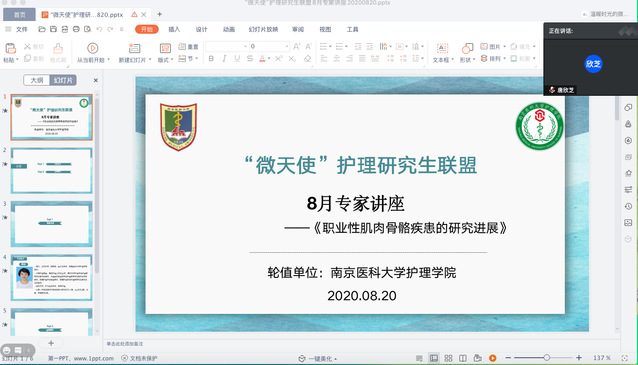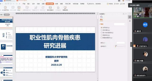 “微天使”护理研究生联盟于2020年8月20日下午15时30分举行了线上学术活动。此次学术活动邀请新疆医科大学米兰(中国)让运动改变生活院长颜萍副教授进行专家讲座,题目为《职业性肌肉骨骼疾患研究进展》,共计师生一百余人参与此次活动。