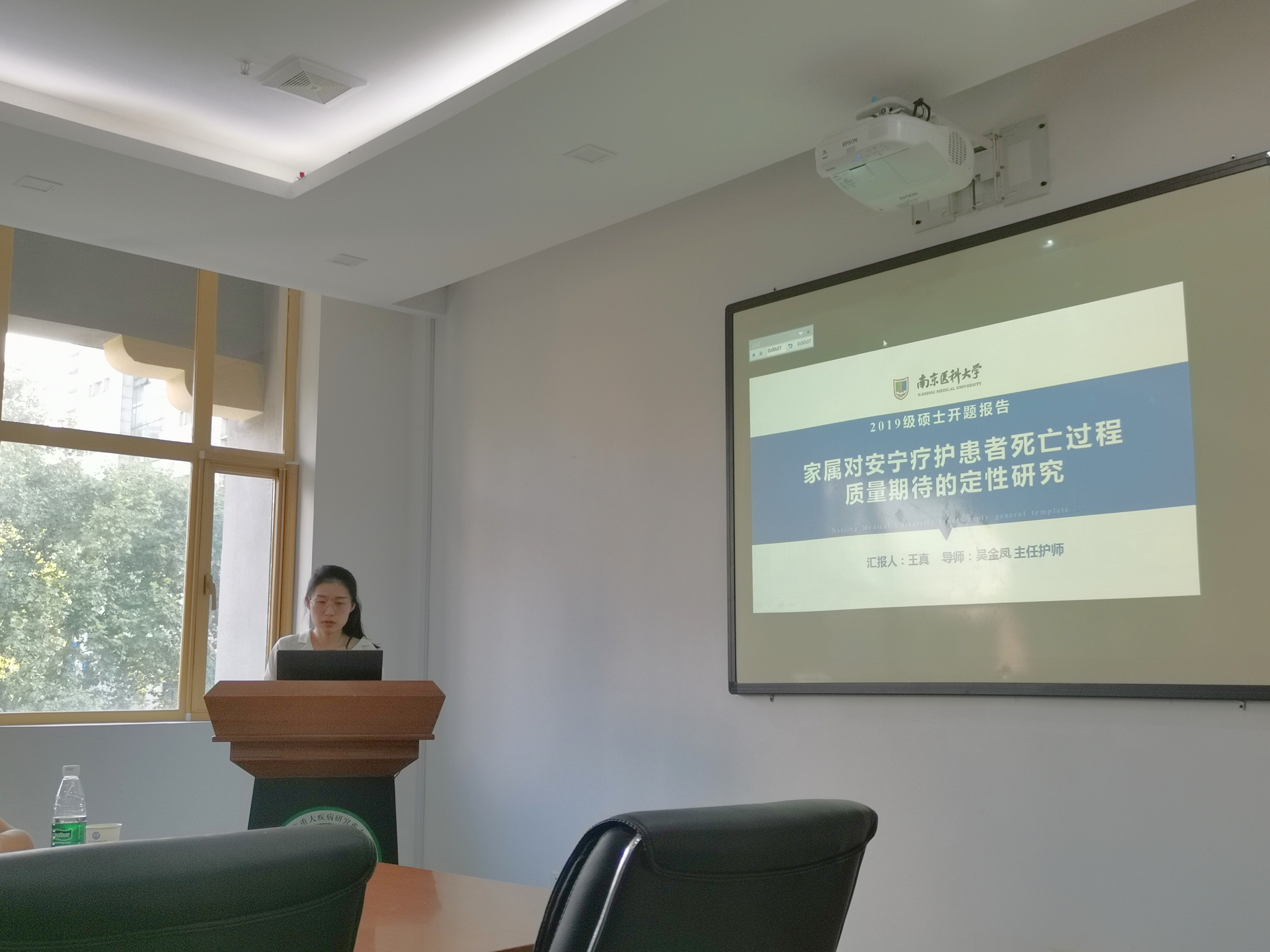 此次报告会分两组进行,由崔焱教授、许家仁教授、王守林教授、吴金凤主任护师、莫永珍主任护师、丁亚萍副教授、李现文副教授、王洁副教授担任评审专家,季明辉和单恩芳老师担任秘书,参加本次开题报告的硕士研究生共13名。