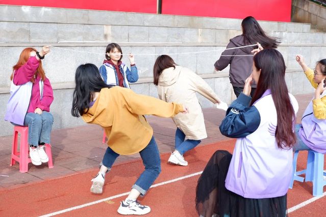 四名志愿者拉紧两条高度分别设置为1.4米和1.2米的绳子,参赛者就需要下腰从绳下过去,使得活动更加充满挑战性,还增添了许多欢声笑语。