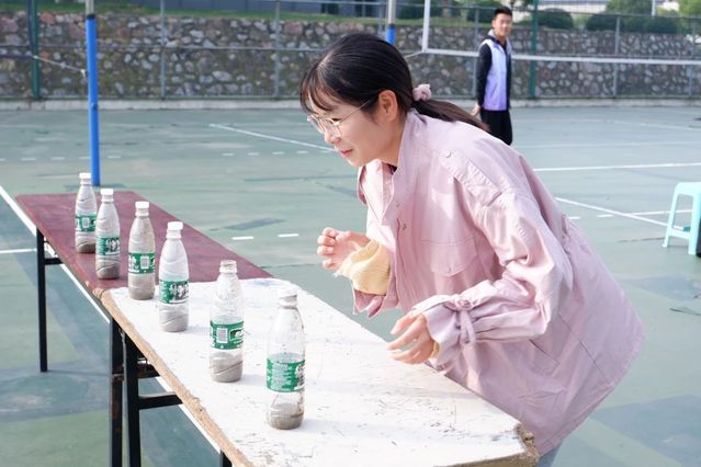 弹瓶盖项目,看似简单,实则考验了大家的平衡能力,按照规则转完10圈之后,多数参赛者已是晕头转向,更别提沿直线走去弹瓶盖。