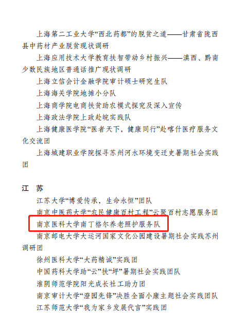 近期,2020年全国大中专学生志愿者暑期“三下乡”社会实践活动优秀团队评选活动结果揭晓。南京医科大学南丁格尔养老照护服务队获评全国“优秀团队”。