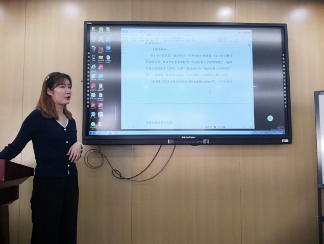 随后,徐晔星老师向同学们介绍了其所分管的工作,并一一做了详细解释。她提出,作为学生和研究生院的桥梁,学院在确保研究生各项培养工作稳步开展的同时,同学们要发挥主观能动性,与导师保持紧密的联系,合理安排自己的时间,各类申请、材料提交等工作都要做好时间余量。