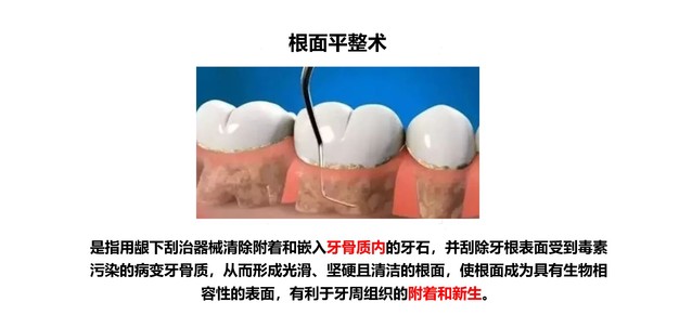 牙周炎的治疗手段主要有龈上洁治术、龈下刮治术和根面平整术;