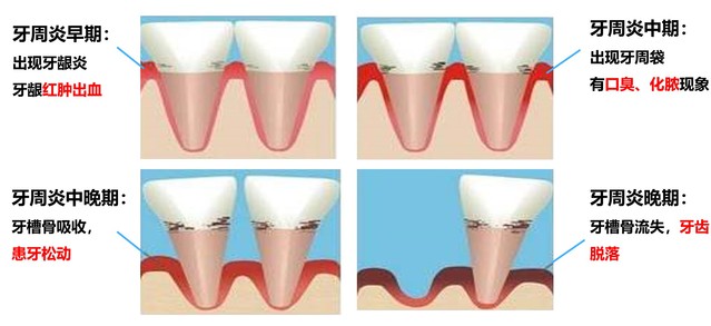牙周炎是一种慢性破坏性疾病,临床上主要表现为牙龈炎症、牙周袋的形成、牙槽骨吸收以及牙齿的松动脱落。