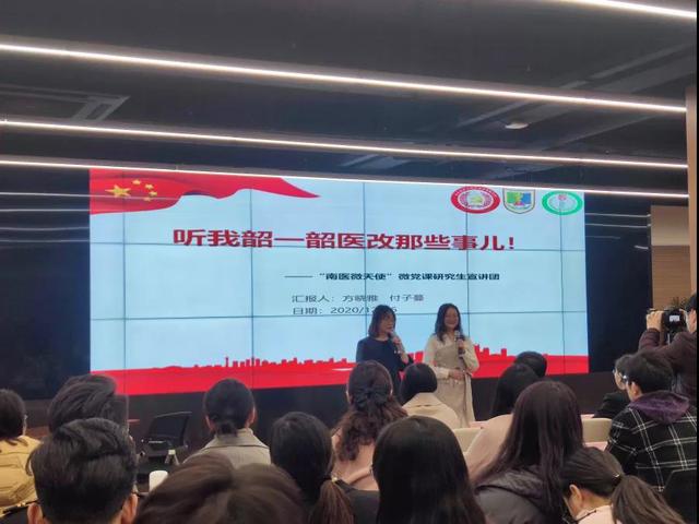 决赛开始,“南医微天使”微党课研究生宣讲团作为“春风化雨”类团队,首先登场宣讲。宣讲人方晓雅、付子蔓同学围绕党的十九届五中全会中医疗改革相关政策,开展了一节主题为《听我韶一韶医改那些事儿!》的微党课。课程安排中由姜肖宇等同学表演的情景剧引起了观众对“电子医保”的关注。