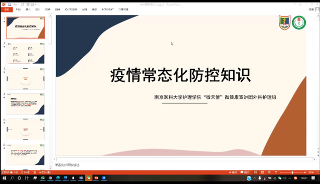 4月10日上午10点,南医“微天使”微健康宣讲团外科护理组以腾讯线上会议形式面向江苏警官学院的同学们开展了《疫情防控常态化,做好防护不松懈》主题健康宣讲,由徐婷、蒋小曼两位同学担任主讲,苏旺等小组成员录制宣讲视频并为大家在线答疑。此次活动受众人群300余人。