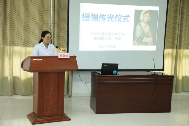 在“5·12”国际护士节来临之际,为弘扬南丁格尔精神,激励学生继承和发扬护理事业的光荣传统,4月26日下午,南京医科大学附属淮安第一医院在临床技能培训中心举行护生授帽传光仪式。护理部主任张青、护理督导屠丽娟、护理部副主任陈梅、张春艳、科护士长吴志娟、薛亚琼、临床教师代表、2018级护理6班的全体同学及部分护理实习生参加了仪式。仪式由教学办公室主任缪蔚云主持。