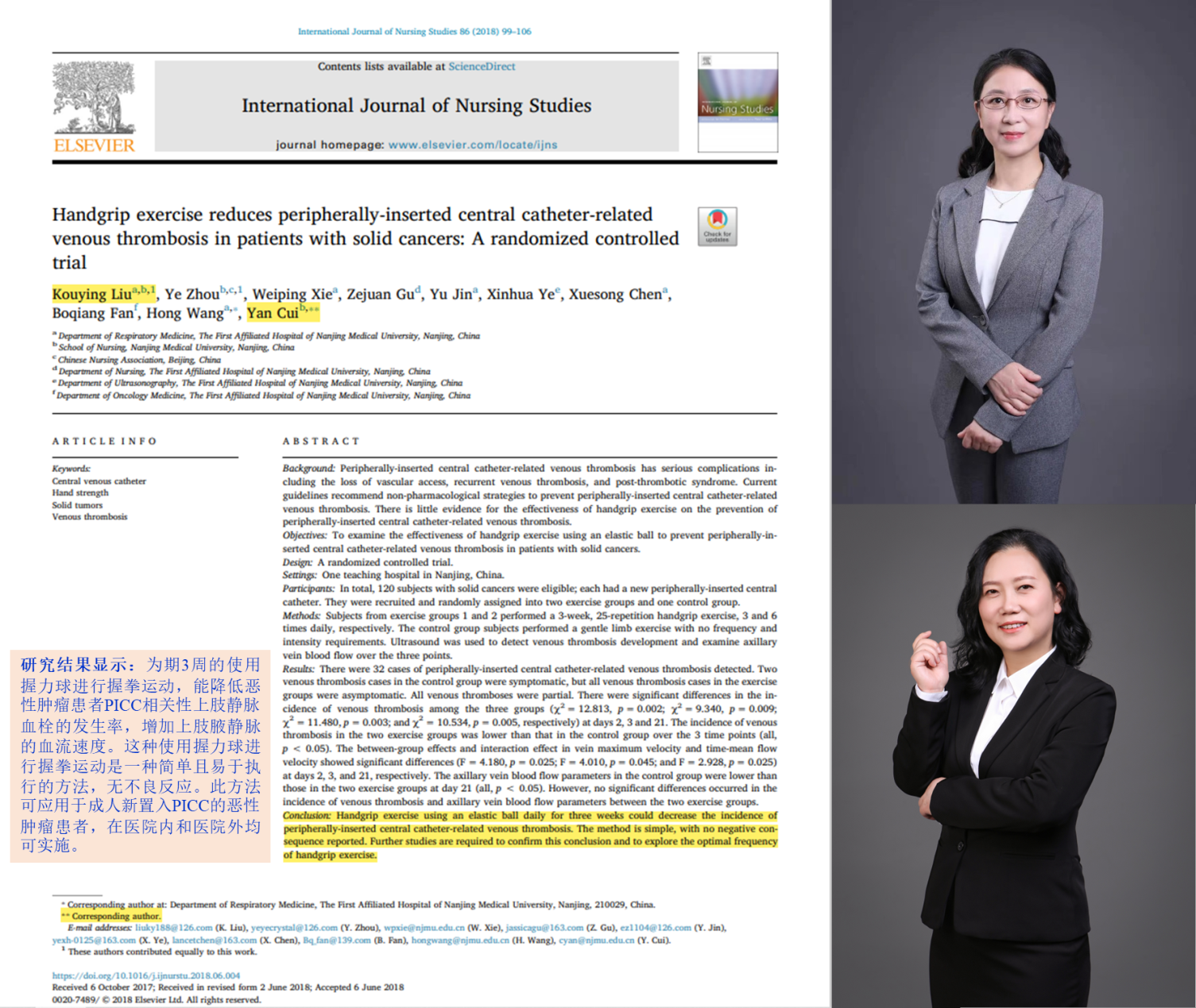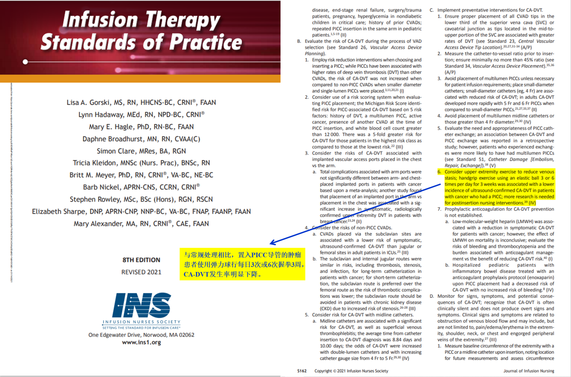 输液治疗是临床最常用的治疗手段之一,每天有数百万人从中受益。全球卫生系统始终致力于实现安全、有效、舒适的输液治疗。为规范静脉治疗操作,美国静脉输液护理学会(Infusion Nursing SocietyINS)制定编写《输液治疗实践标准》,为相关医护人员提供输液治疗的循证依据,并每5年更新一次。2021INS推出第八版标准,我院崔焱教授、刘扣英副教授团队2018年发表的研究成果——《Handgrip exercise reduces peripherally-inserted central catheter-related venous thrombosis in patients with solid cancers: a randomized controlled trial》被写入新标准第七节:血管通路并发症。