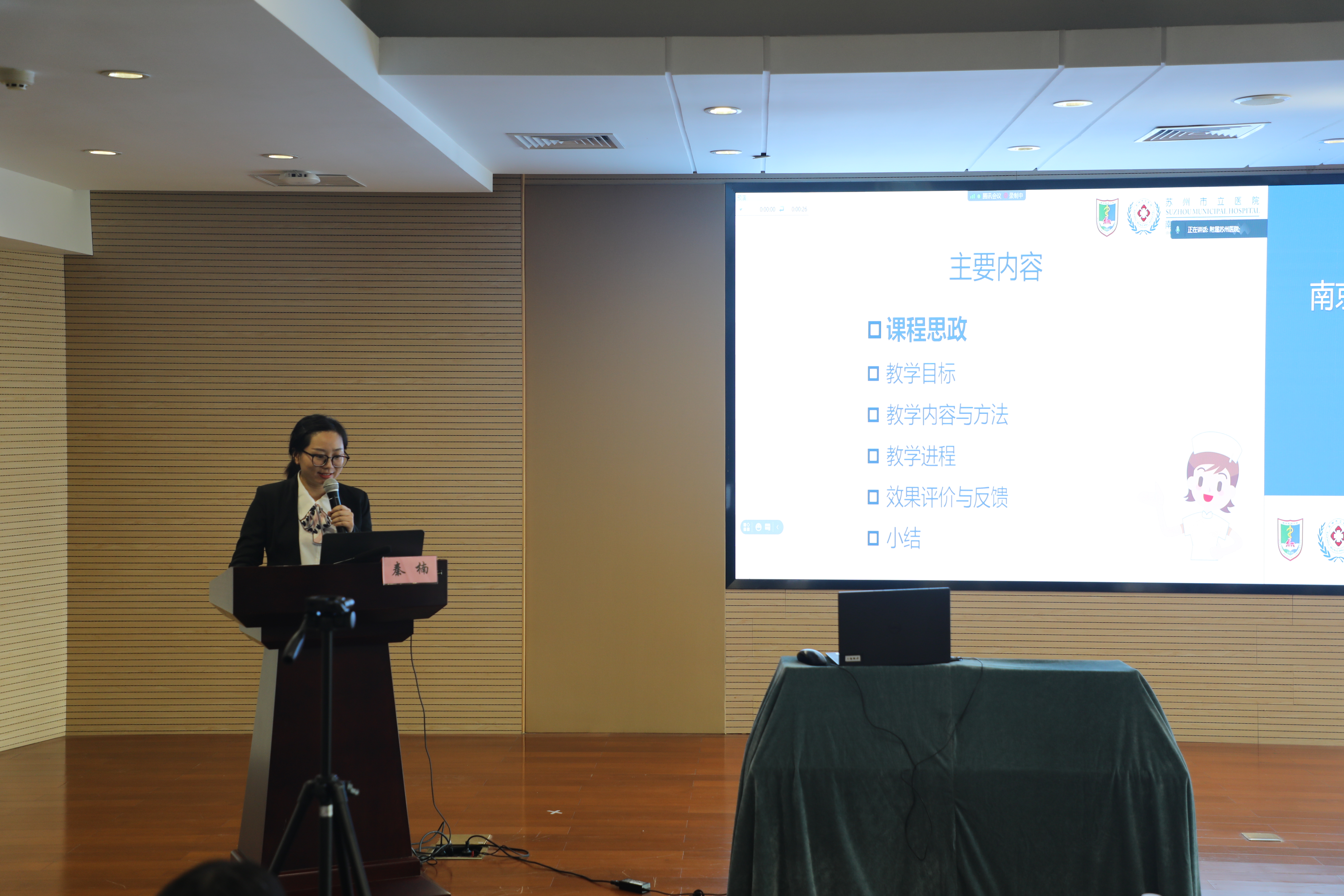 会议第二日为附属苏州医院临床护理教研室课程推荐师资试讲。具体包括两部分内容,第一部分为7名护理临床教师的理论课试讲,随后五位督导就教师们试讲内容进行了点评。第二部分为4名护理临床见习教师的见习课说课试讲,并由督导们进行点评。会议开始前,附属苏州医院张中伟院长为本次会议致辞,张院长代表医院感谢学校为深化临床教学基地内涵建设,提升教学质量提供的大力帮助,并期望借此机会不断加强院院之间的交流与合作,达到共赢发展的目标。