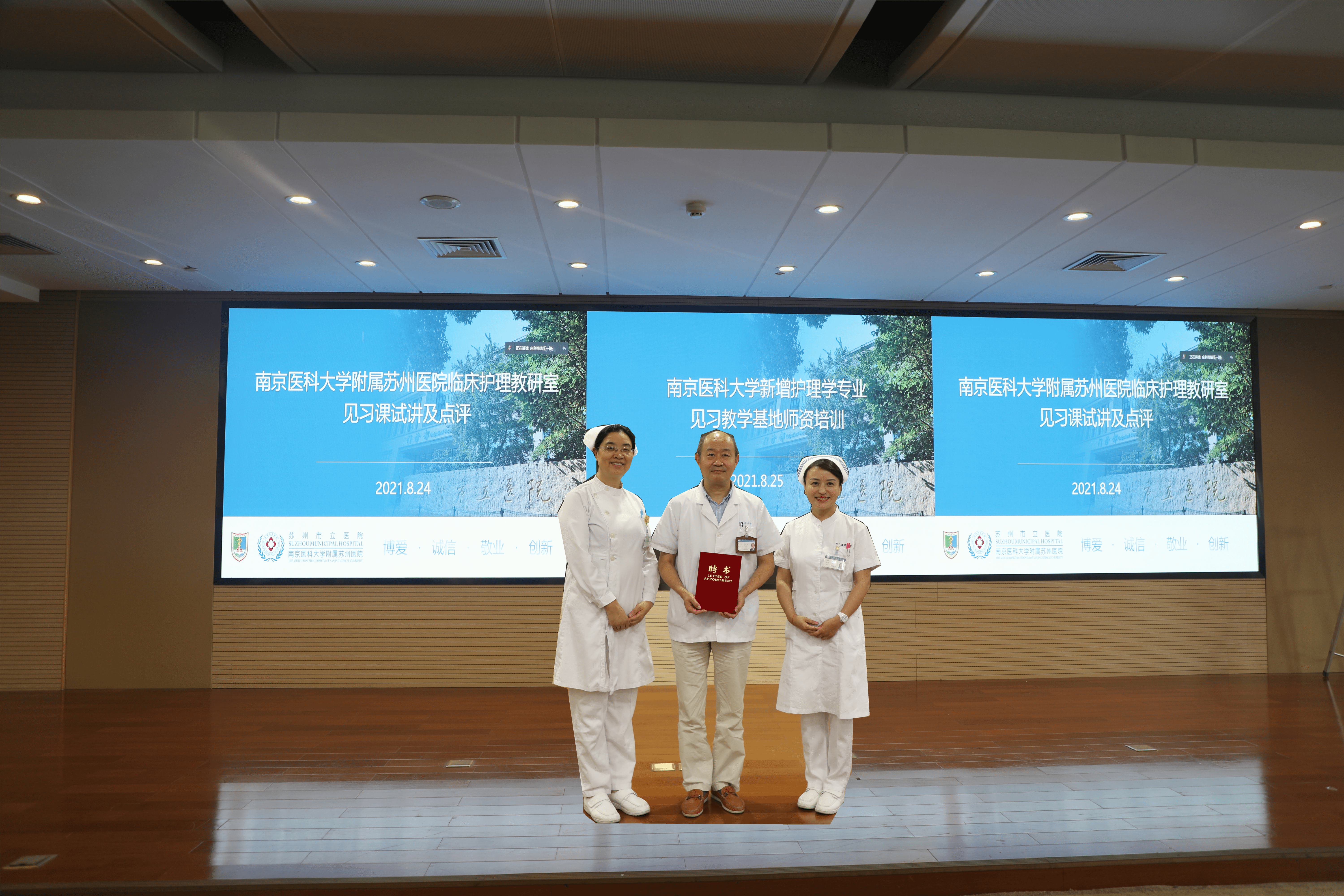 最后,医院向王东来院长、蒋玲主任及朱月琴主任颁发了南京医科大学附属苏州医院临床护理教研室教学督导聘书。