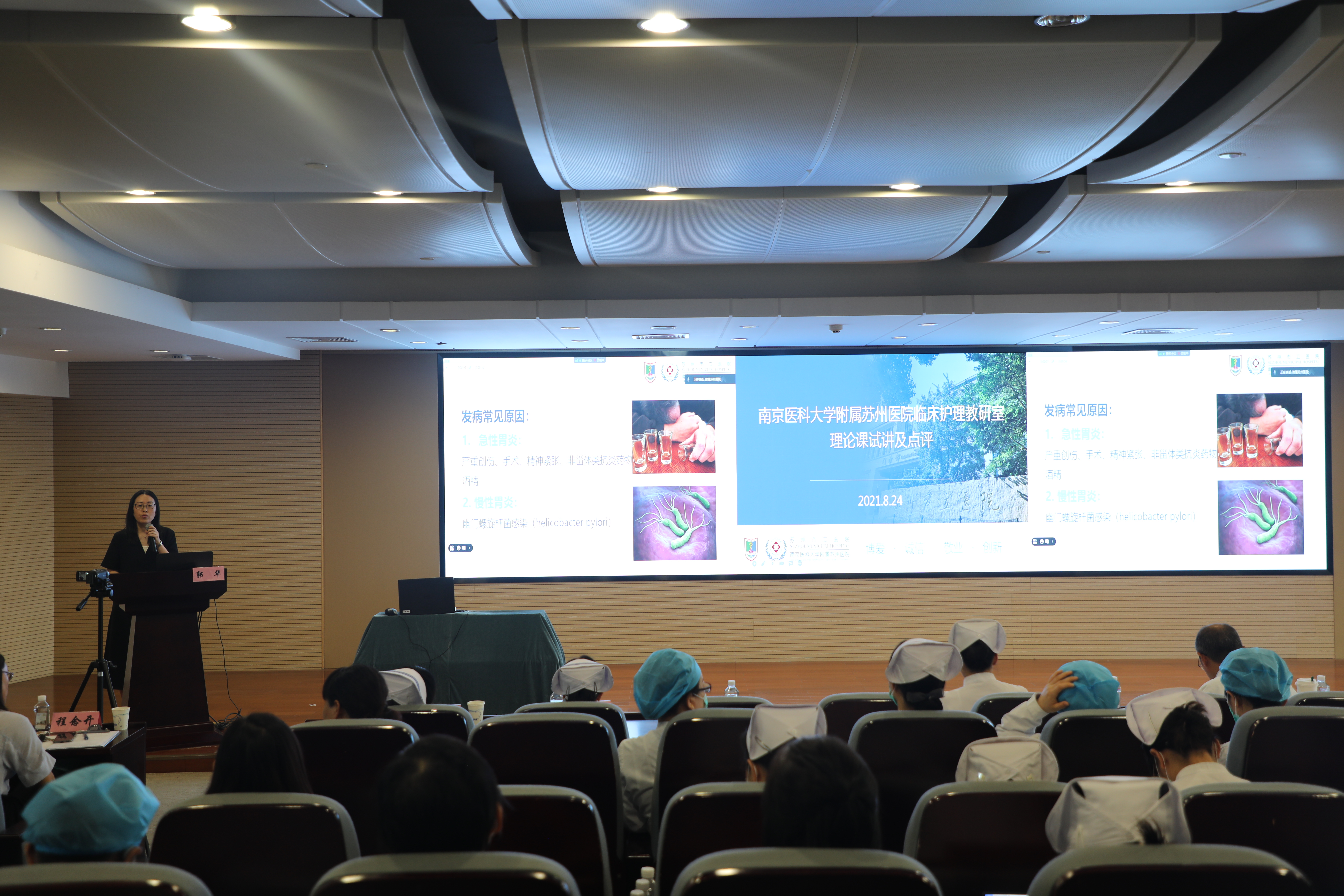 第七位试讲教师营养学护理教研组的郭华老师,围绕营养与胃炎的章节内容进行授课,对慢性胃炎的概念,病因,临床表现,营养治疗,护理及食物选择方面进行具体的阐述。