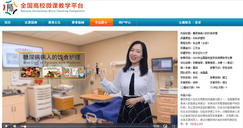 雷阳老师的作品《糖尿病病人的饮食护理》荣获一等奖,该作品结构清晰、要点互通,结合临床实践方法,且融入了人文素质教育。以临床真实案例导入,通过对糖尿病饮食的刻板印象的反思,激发学生的学习兴趣。核心知识的讲解以充分贴近学生生活的举例出发,结合流程图、动画、示教、案例贯穿、提问引导、模具演示等,帮助学生达到知识、能力、情感方面的教学目标。