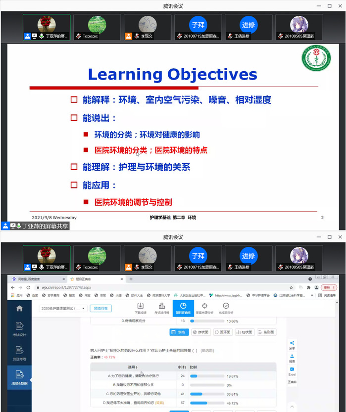为加强对校本部及见习教学基地的教学质量监控管理,保证疫情期间的线上课程教学质量,根据《米兰体育听课评教制度》、医学教育研究所《关于开展2021-2022 学年第一学期在线教学听课评教周工作的通知》,我院确定开学第一周“听课评教周”,组织校本部和七家见习教学基地(临床护理教研室)开展听课评教工作。