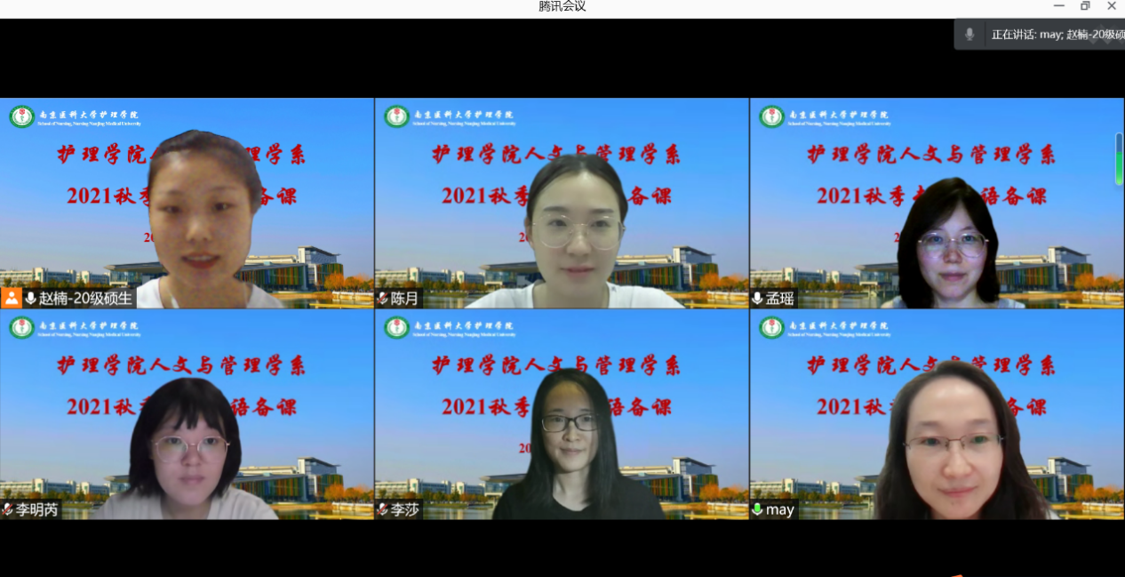 为提高教学质量,精化课程设置,8月30日晚19点,护理人文与管理学系线上开展了2021年秋季学期专业英语课程的集体备课活动。参会人员有教师杨如美、孟瑶、陈月、李莎、李明芮及本课程助教赵楠,拟授课对象为2020级硕士研究生。本次活动由课程负责人杨如美老师主持。
