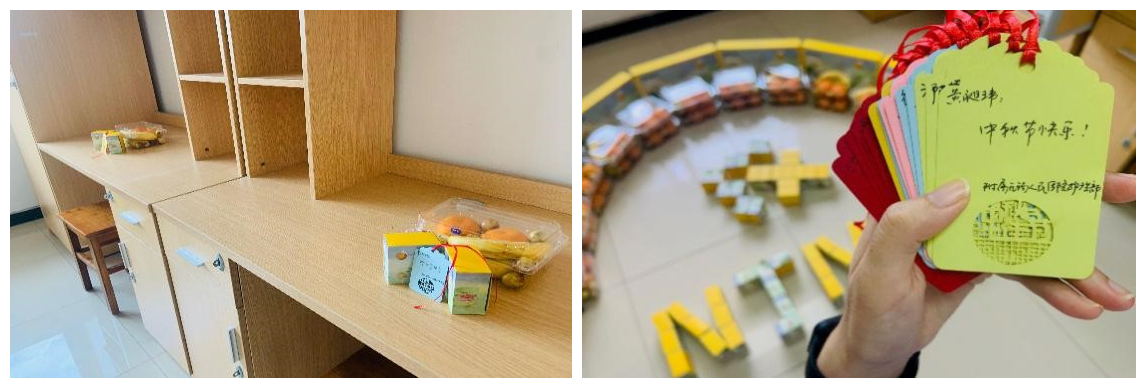 进到宿舍之后看到老师们为每个人准备的祝福语和精美的中秋礼物,大家一天的疲惫顿时烟消云散。祝福不能升值,但是幸福可以使心升温;问候不能刷卡,但是友情可以使快乐免费。来无锡的第一天同学们就找到了幸福感和归属感。