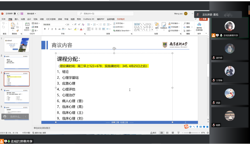 为了下学期《护理心理学》课程的顺利开展,发挥课程育人和心理育人协同效应,护理心理学备课组于12月24号在网络平台开展了集体备课会,对该课程理论和实践课进行集中讨论,重点对课时分配、留学生课程团队建设、案例讨论等内容进行了研讨。一附院王雪梅老师、脑科医院高颖老师,学院嵇艳老师、孟瑶老师、雷阳老师以及助教聂作婷参加了本次会议。