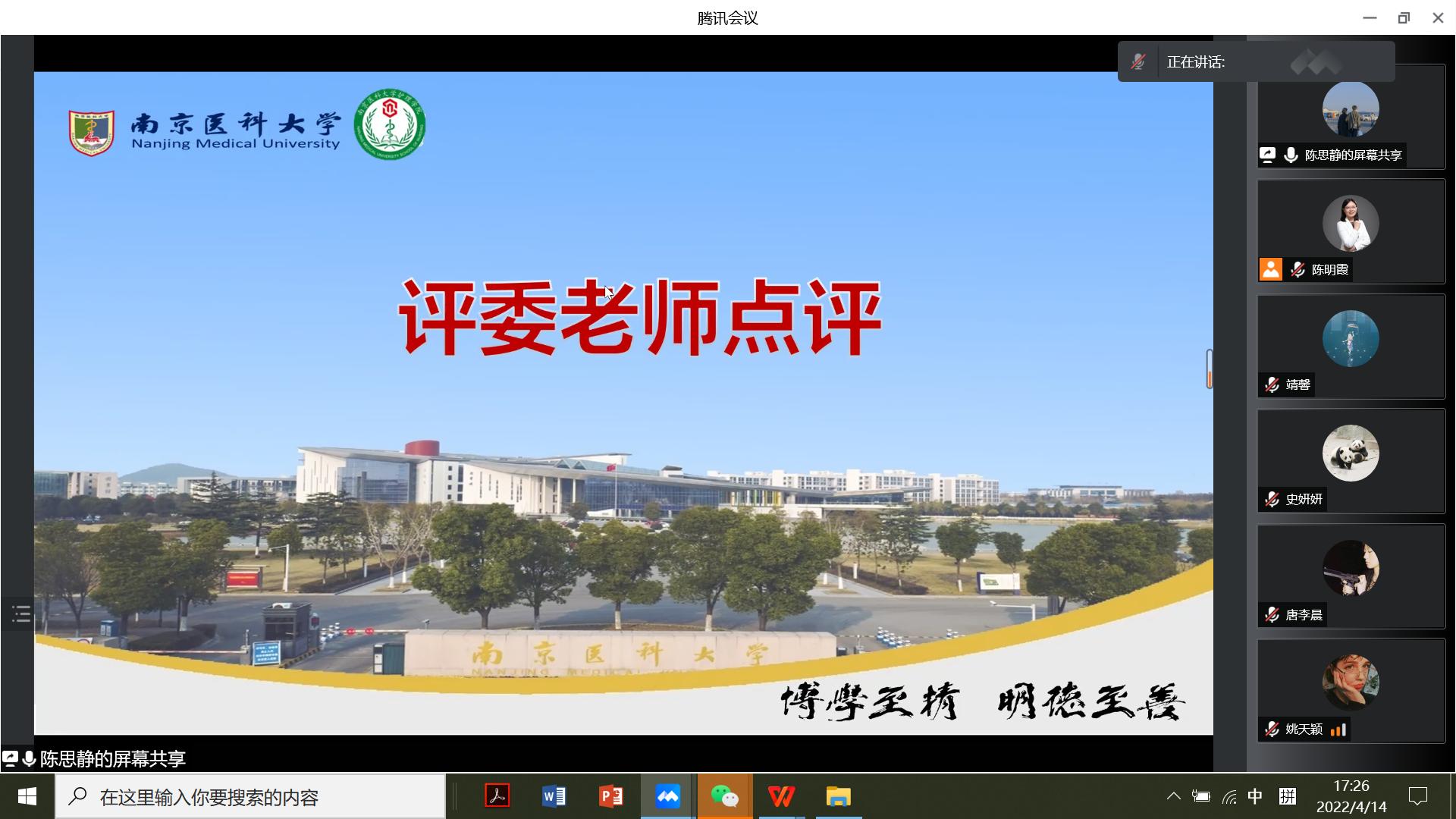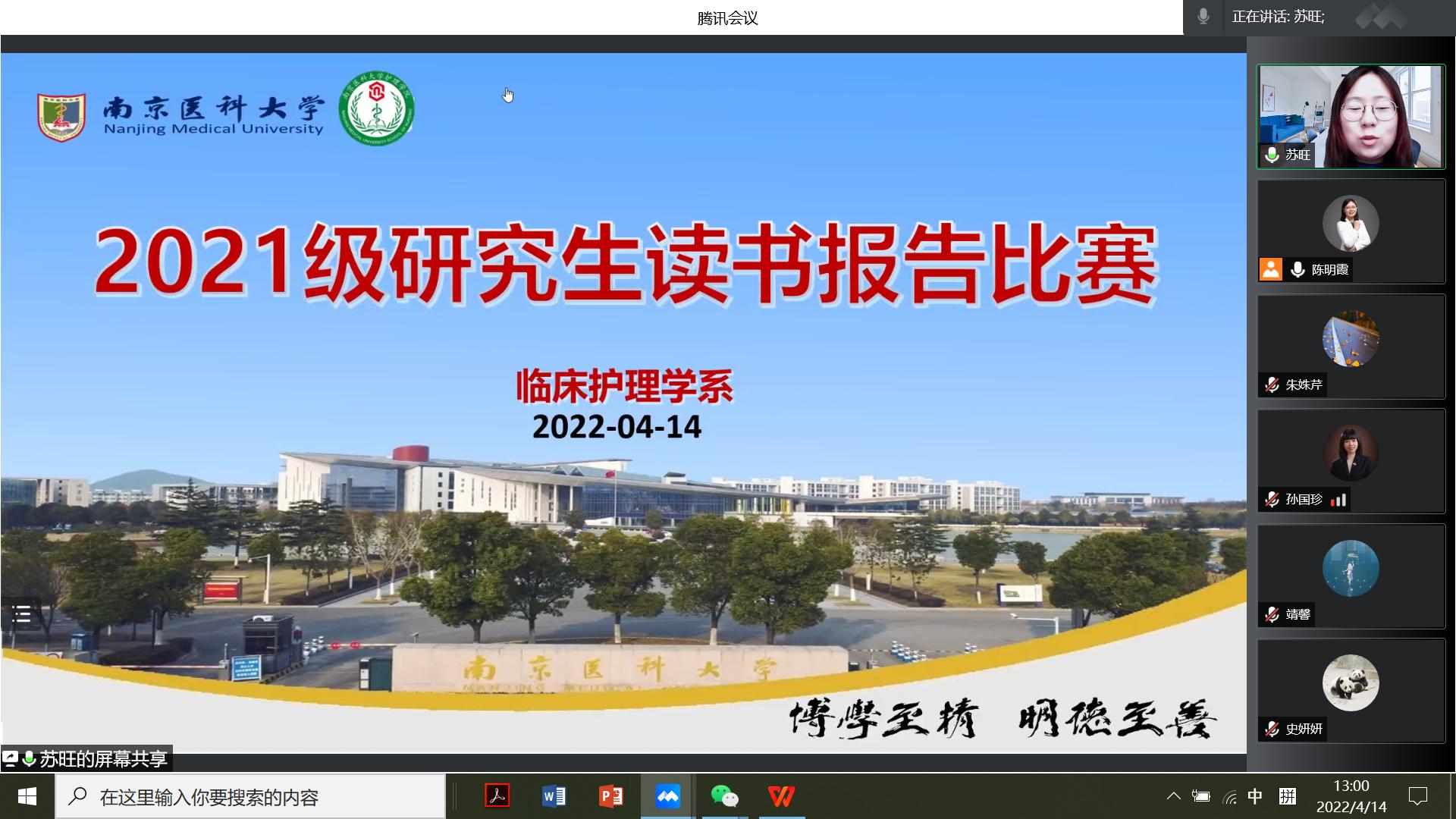2022年4月14日下午,我院临床护理学系2021级研究生读书报告比赛在线上举行。本次活动邀请了米兰(中国)让运动改变生活院长许勤教授、孙国珍教授、刘扣英副教授、陈明霞副教授、冯建萍老师以及单春剑老师担任评委,2020级研究生苏旺、陈思静主持,临床护理学系老师、研究生等参与本次活动。