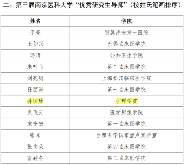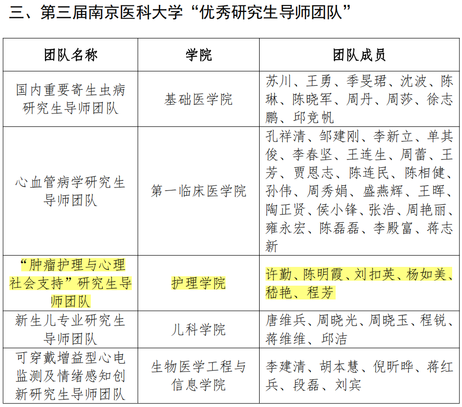 近日,南京医科大学研究生院下发了南医大研(2022)15号“关于表彰第三届南京医科大学“十佳研究生导师”、“优秀研究生导师”及“优秀研究生导师团队”的决定”。我院孙国珍教授荣获第三届南京医科大学“优秀研究生导师”、“肿瘤护理与心理社会支持”研究生导师团队荣获第三届南京医科大学“优秀研究生导师团队”。