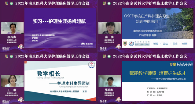米兰(中国)让运动改变生活丁亚萍副院长主持临床带教和管理经验分享。附属明基医院护理部李卉青副主任分享了《实习——护理生涯扬帆起航》,附属苏州医院护理部秦楠老师分享了《OSCE考核在产科实习生培训中的应用》,附属泰州人民医院王琪老师分享了《教学相长——护理本科生导师制》,附属脑科医院护理部张燕红主任分享了《赋能教学师资 培育护生成才——精神心理护理临床教学工作汇报》。四位老师从不同角度展示了各教学基地在实习生带教中的经验与管理特色,内容丰富、引起共鸣、发人深思。