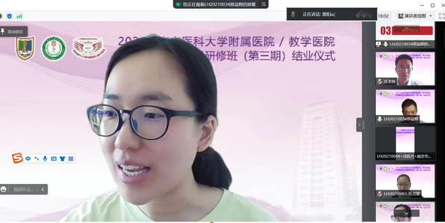 南京医科大学附属老年医院胡婷婷作为学员代表进行发言。她代表即将毕业的2021级全体研修班学员向辛勤授课的各位老师表示最衷心的感谢和最崇高的敬意,一年的研修班学习时光转瞬即逝,老师们用实事求是、一丝不苟的科学态度,勇于创新、求真务实的态度学术精神深深地影响着学员们。学员们将做到知行合一、学以致用,心系国家、心系学校,在未来一定有担当有作为,在实现中国梦伟大实践中创造自己的出彩人生。