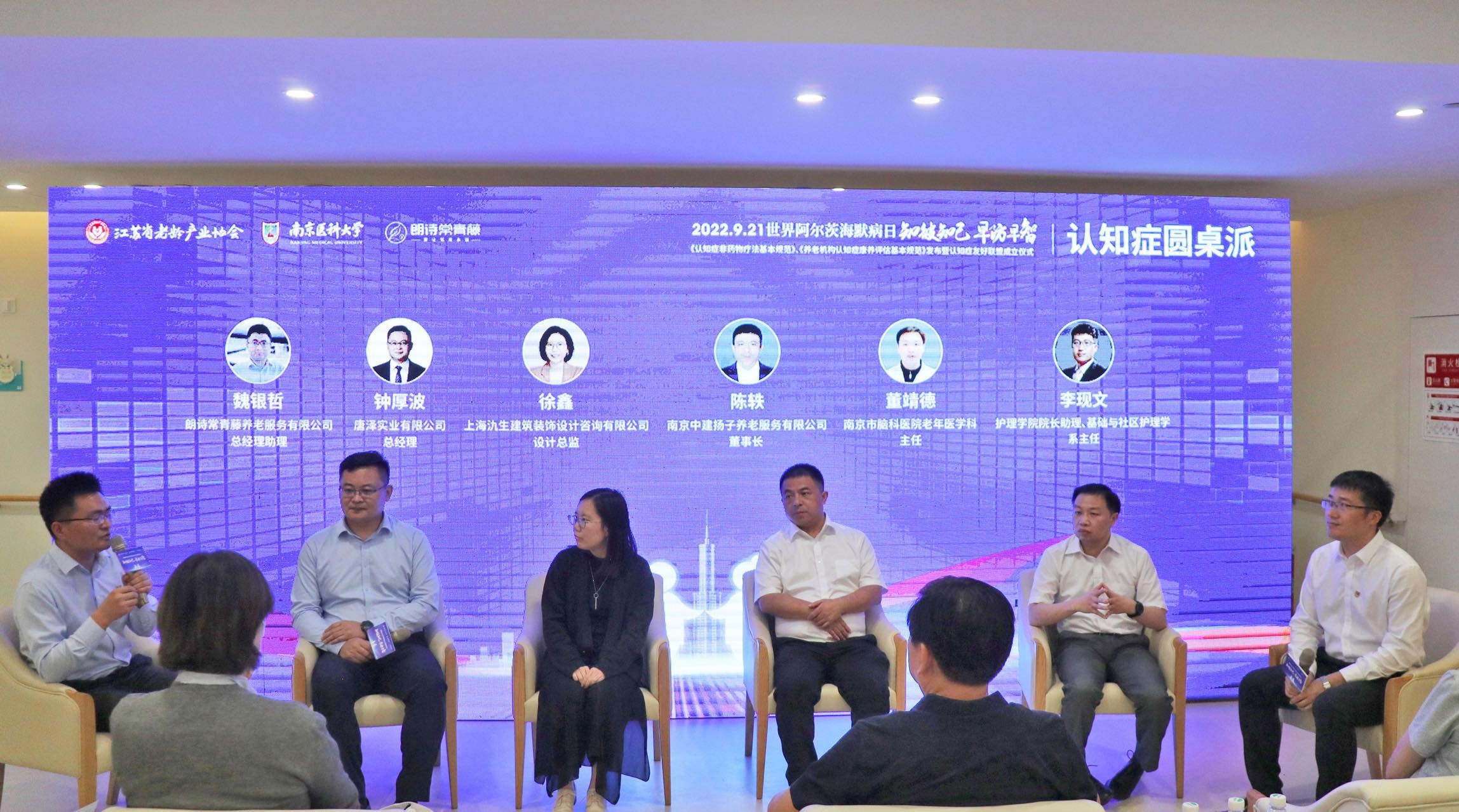 江苏省老龄产业协会会长张建平在致辞从团体标准对实践的指导、团体标准对认知症照护质量提升等角度肯定了两项团体标准制定与发布的重要意义,并对团体标准推广、认知症照护人才培养等提出期望。米兰(中国)让运动改变生活院长助理、基础与社区护理学系主任李现文代表团体标准起草组从标准起草背景、主要内容、修订与审查过程、特色与创新、未来应用等方面对团体标准予以解读。朗诗常青藤养老服务有限公司总经理助理魏银哲对团体标准的实际应用进行了分享。随后,江苏省老龄产业协会会长张建平、南京市卫健委一级调研员傅晓红、江北新区卫生健康和民政党工委副书记李建新、米兰体育副院长丁亚萍、南京朗诗常青藤养老服务有限公司总经理罗丹共同开启认知症团体标准发布仪式。在最后的认知症圆桌派环节,李现文、魏银哲作为活动主持,与唐泽实业有限公司总经理钟厚波、上海氿生建筑装饰设计咨询有限公司设计总监徐鑫、南京脑科医院老年医学科副主任董靖德、南京中建扬子养老服务有限公司董事长陈轶等多位专家共同交流分享了认知症领域的探索与实践。